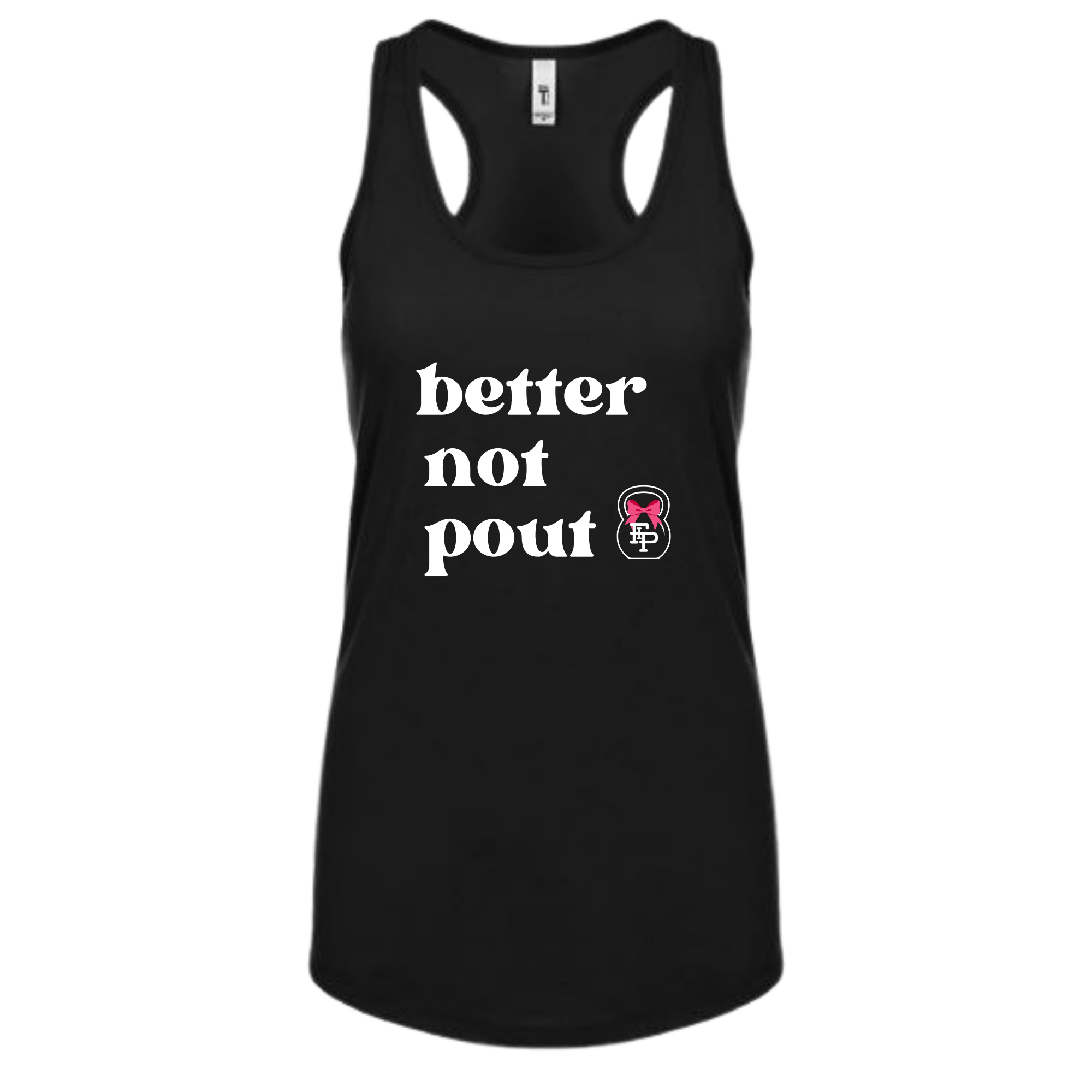 Bring the holiday sass to your sweat session with our Better Not Pout Tank. This black tank features bold white lettering and a kettlebell wrapped in a cute pink bow—because even Santa knows strong girls lift. Made with our soft, breathable fabric, it’s perfect for crushing workouts, running errands, or spreading a little merry muscle everywhere you go. Finished with our Flex it Pink logo inside the kettlebell for that extra touch of FiP magic.
