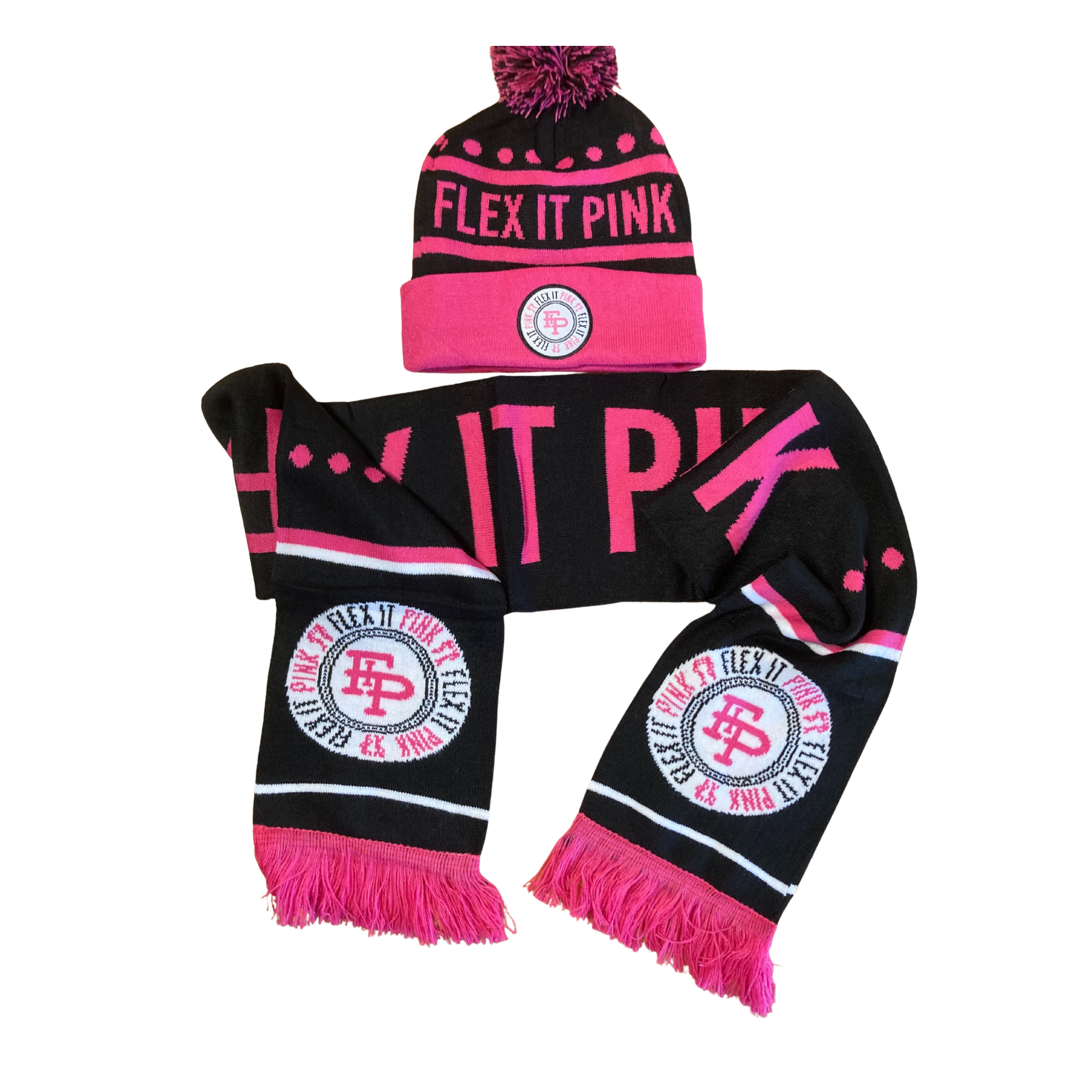 This limited-edition black and pink knit scarf pairs perfectly with your November VIP Pom Beanie — soft, stylish, and made to show off your Flex It Pink pride. Only 100 available, so grab yours before they’re gone!